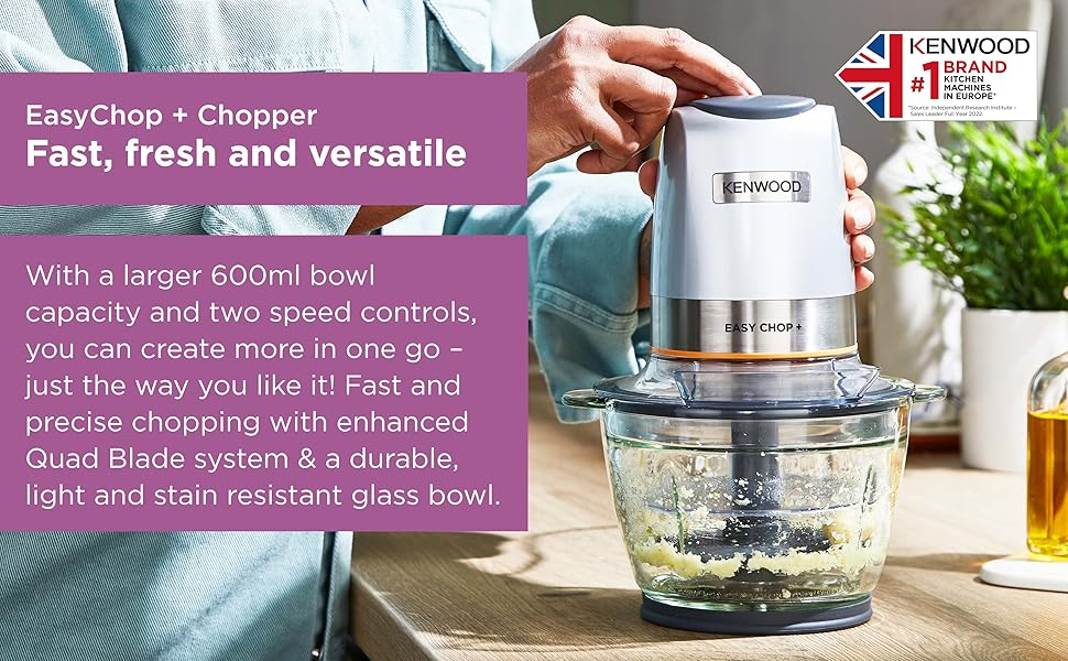 Quad Blade System: Four ultra-sharp stainless steel blades for fast, uniform chopping results