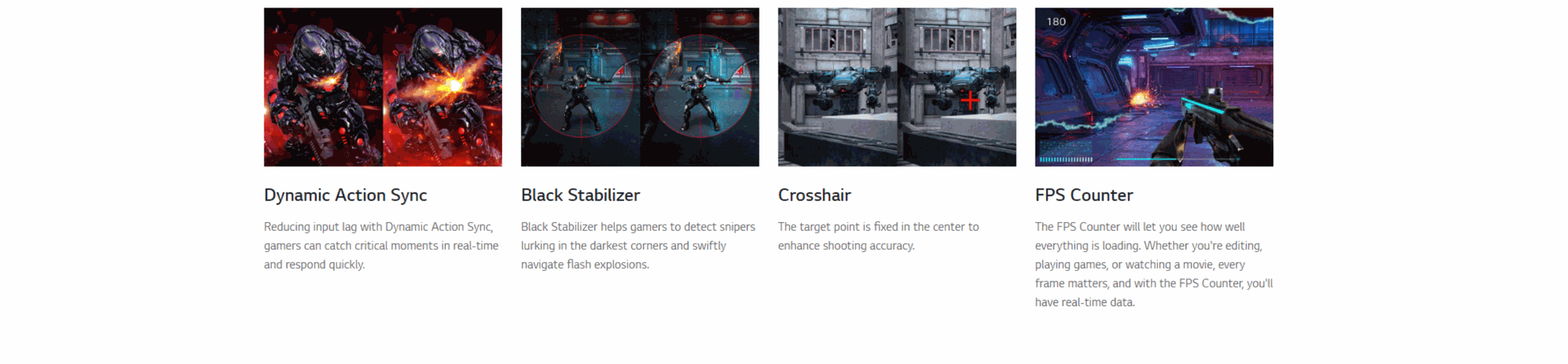 Gaming Enhancements: Features such as Black Stabilizer, Dynamic Action Sync (DAS), Crosshair, and FPS Counter help optimize gameplay visibility and performance.