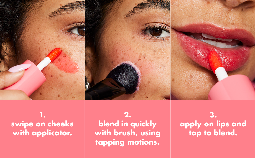 Apply a small amount to cheeks or lips and blend quickly using fingertips, a brush, or a sponge. Build gradually for the desired colour intensity.