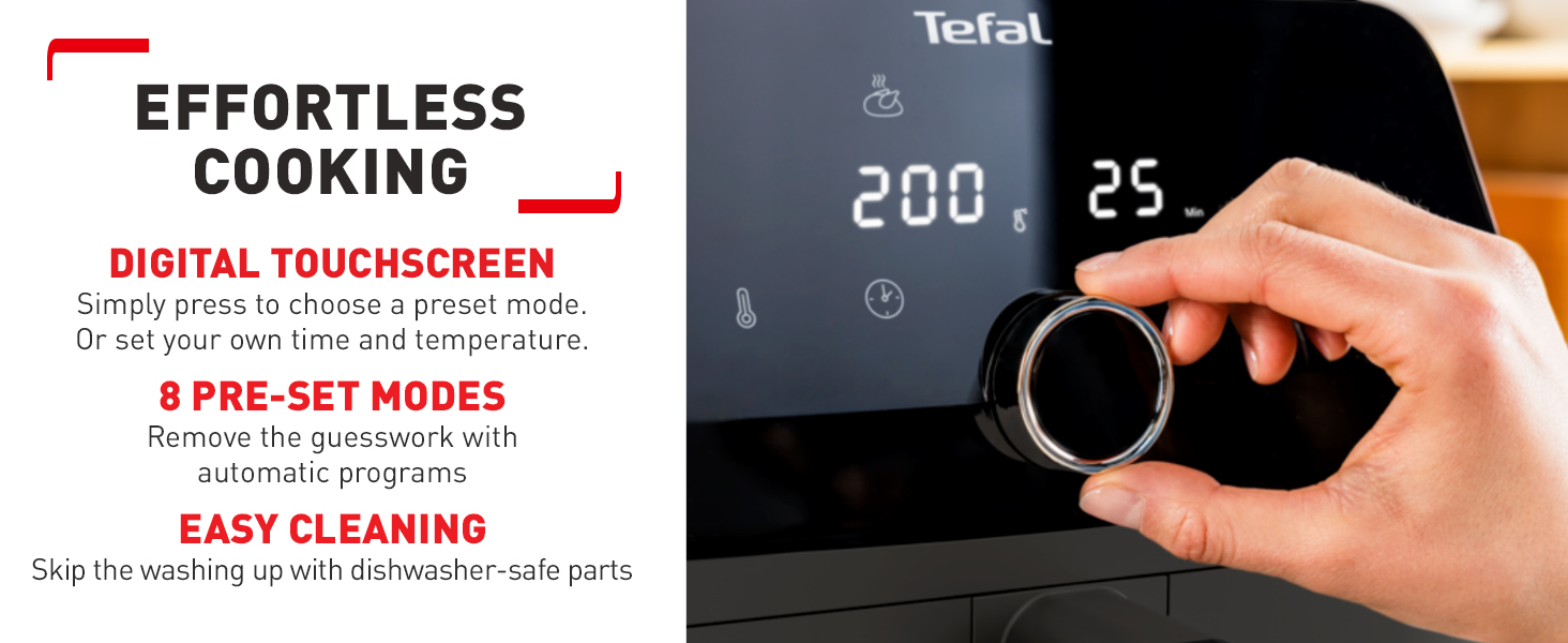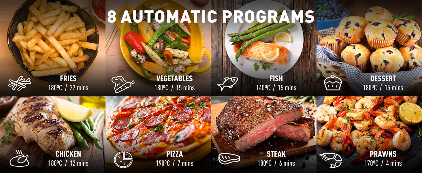 8 Preset programs: One‑touch cooking for fries, chicken, fish, pizza, dessert, vegetables, etc.