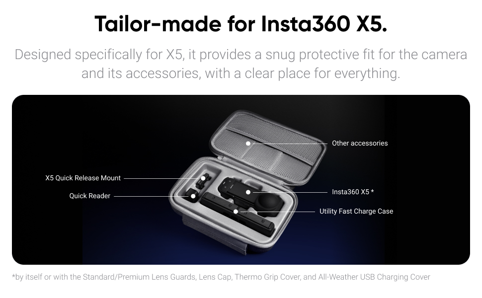 Perfect Fit for X5 & Accessories Tailored internal layout fits the X5 camera (with or without lens guards), spare batteries, USB charging hub, quick reader, cables, mounts, and more.