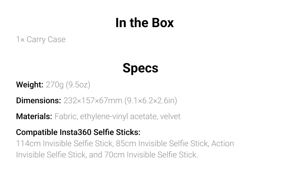 | Compatibility | Insta360 X5, lens guards, external accessories (hub, mounts, sticks) |