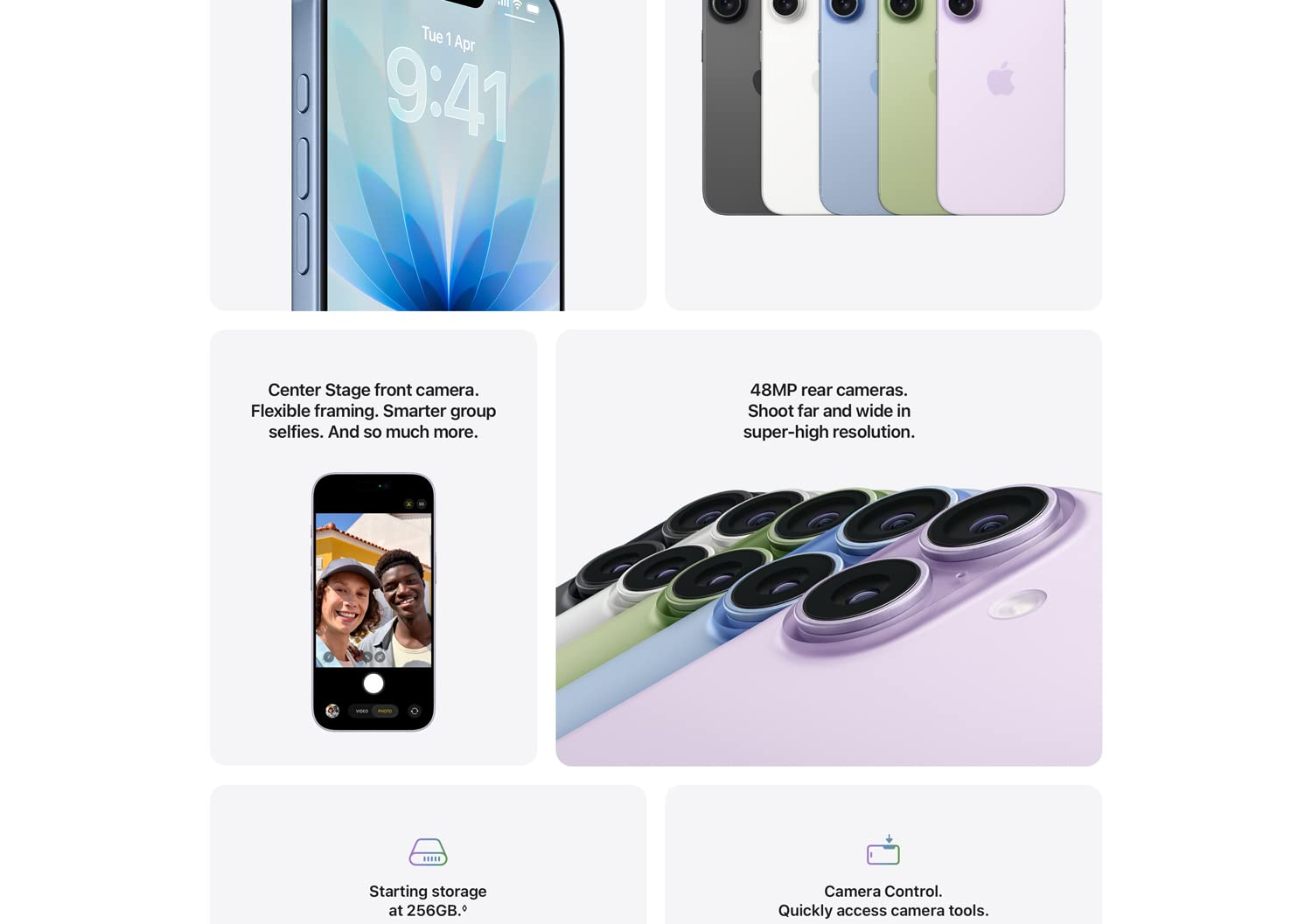 Dual 48MP Camera System Includes Main and Ultra Wide lenses with Night mode, Smart HDR 5, and 4K Dolby Vision recording.