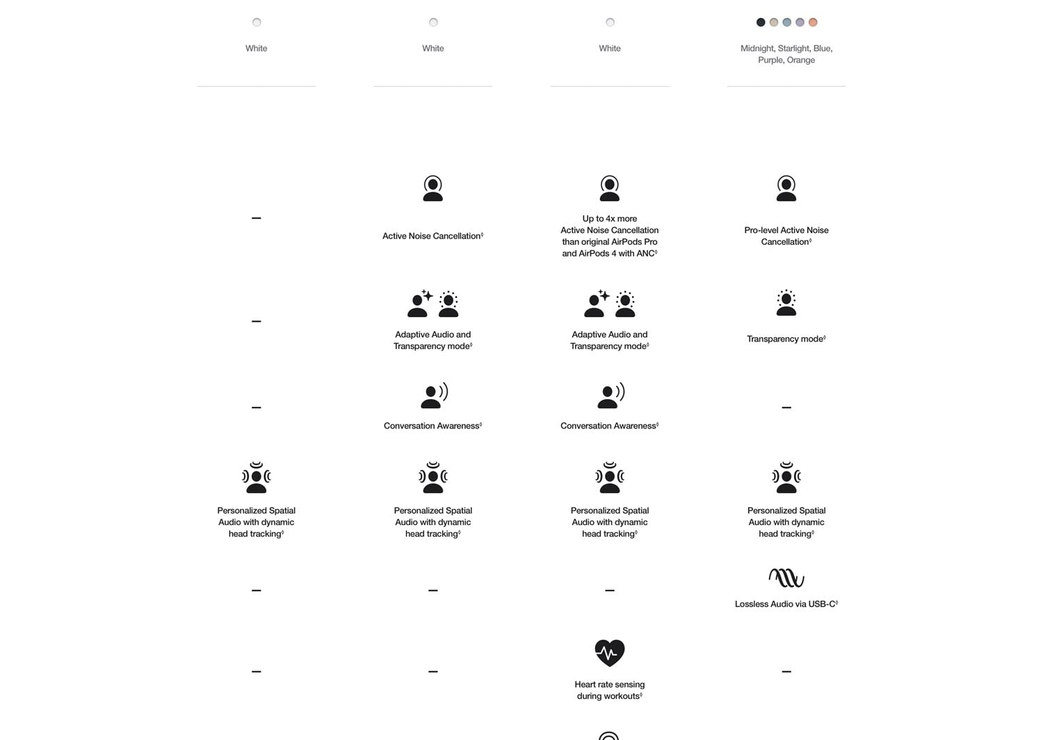 | Noise Control | ANC (up to 2× vs previous Gen), Adaptive Audio, Transparency mode |
