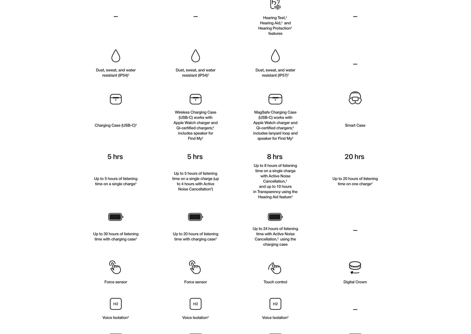 | Listening Time (buds only) | Up to 8 hours with ANC; up to ~7.5 hours with Spatial Audio + head tracking |