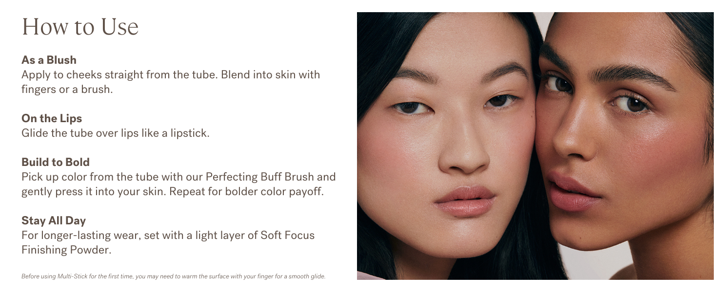 Apply directly to cheeks, lips, or high points of the face and blend using fingertips, a brush, or a sponge. Build gradually to achieve the desired intensity.