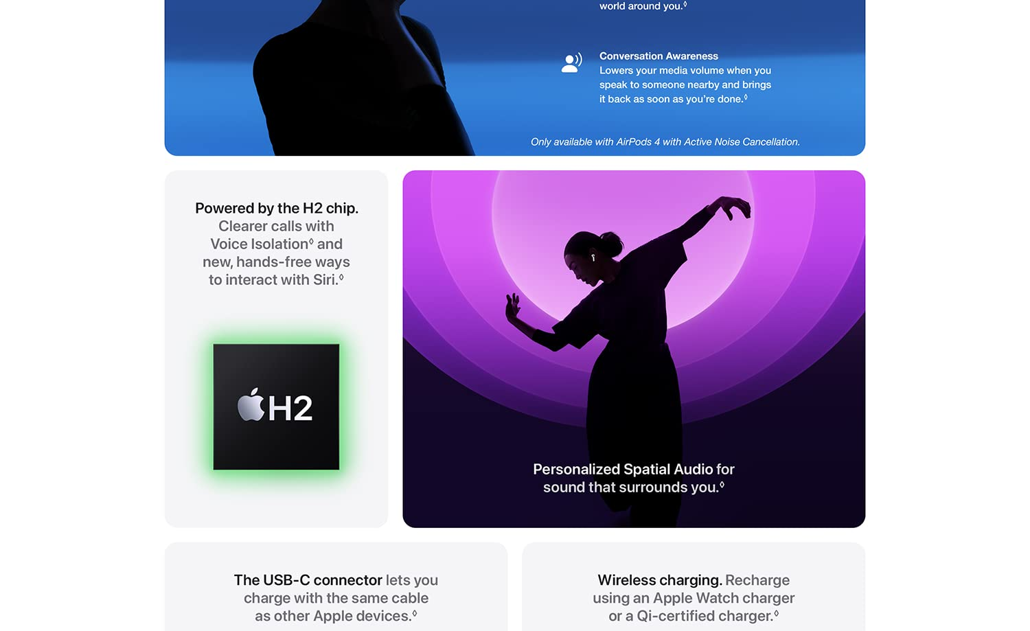 H2 Chip: Enables high‑fidelity audio, Personalized Spatial Audio with dynamic head tracking, and instant device switching.