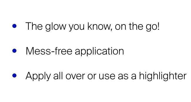 Swipe directly onto the high points of the face or body where you want glow and sun protection. Blend with fingers or a brush. Reapply as needed, especially when exposed to the sun.