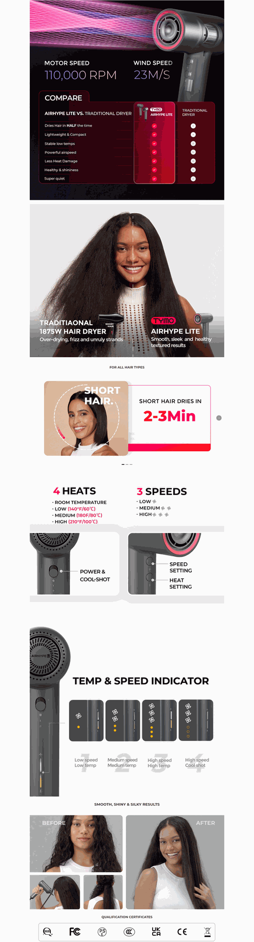 3 Magnetic Nozzles include a smoothing (concentrator), a comb nozzle, and a diffuser for styling versatility.